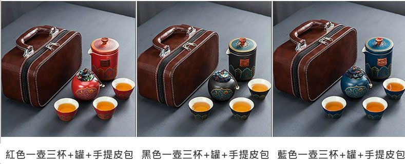復古茶具套裝【紅色】一組(一壺三杯+茶葉罐+手提皮包)