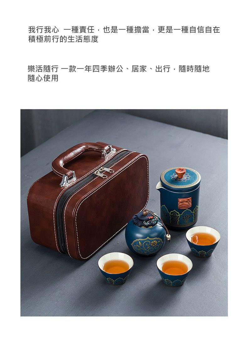 復古茶具套裝【藍色】一組(一壺三杯+茶葉罐+手提皮包)