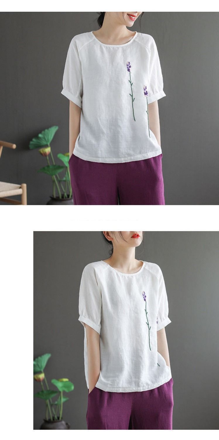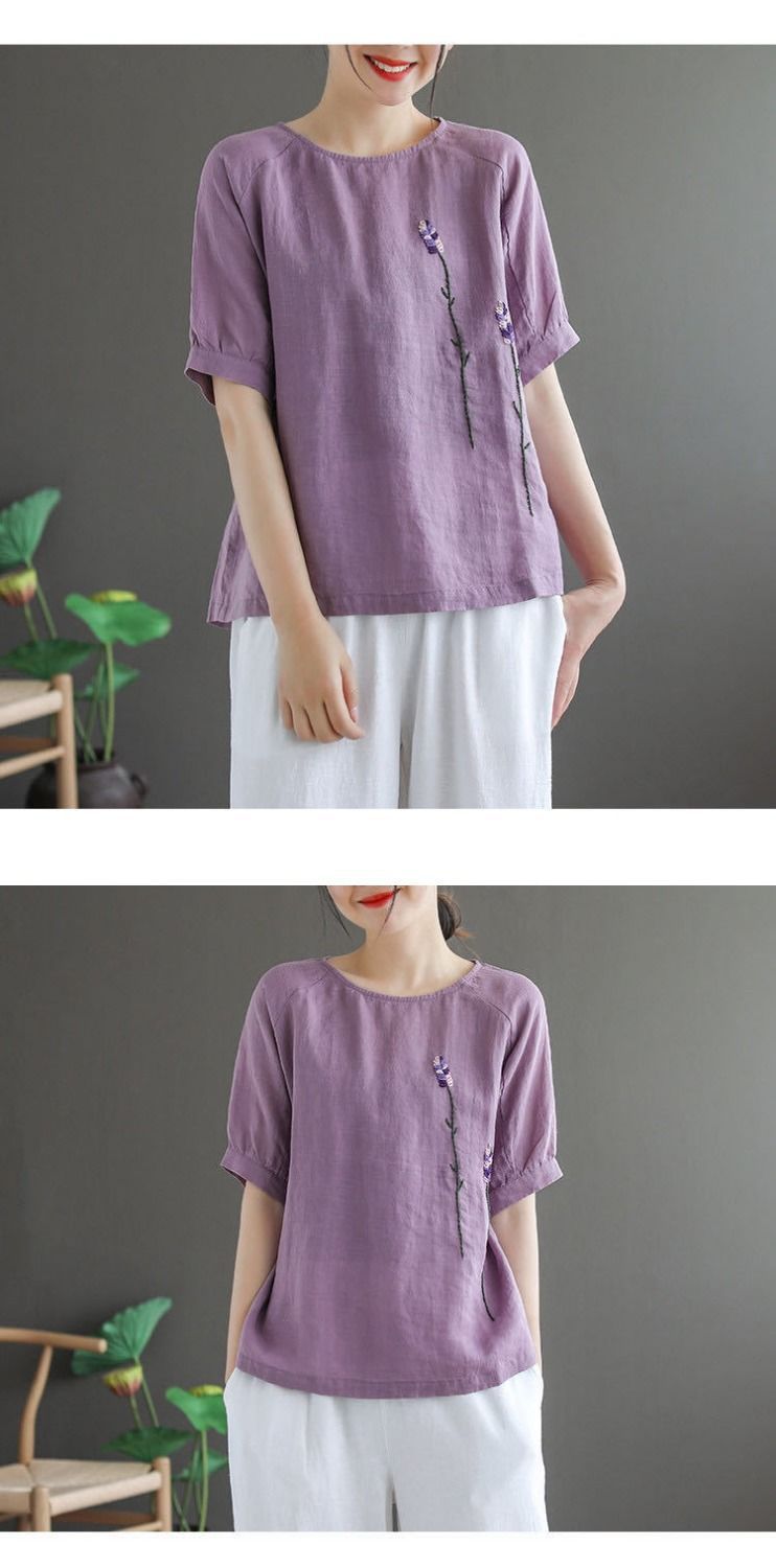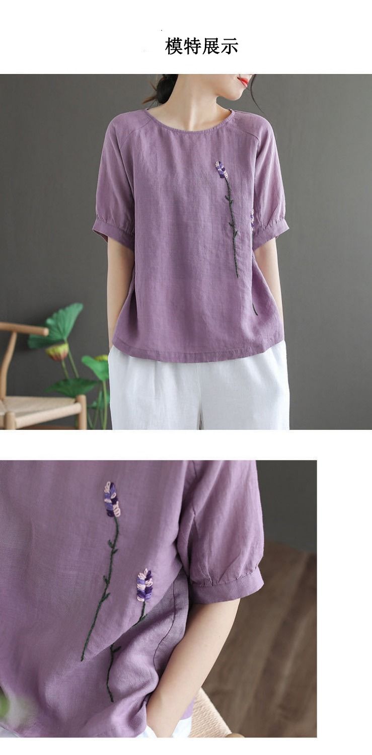 花朵刺繡棉麻T恤【買一送一】紫色+白色各一件(每件499元)