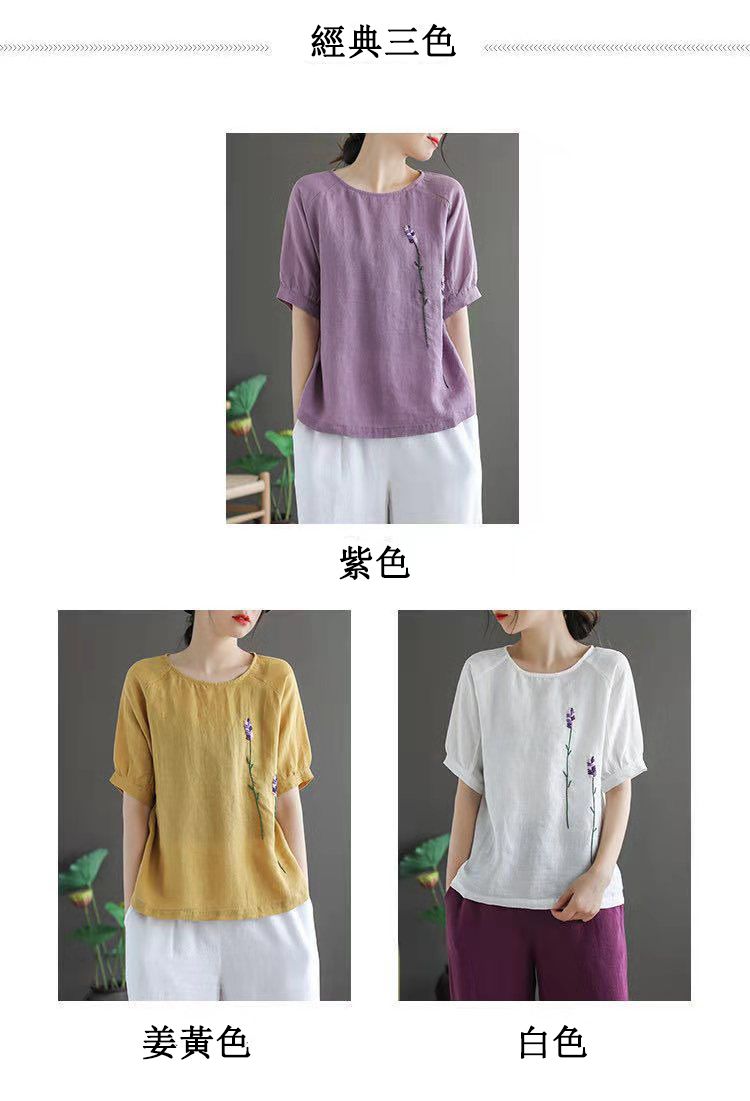 花朵刺繡棉麻T恤【秒殺3件】紫色+白色+黃色各一件(每件433元)