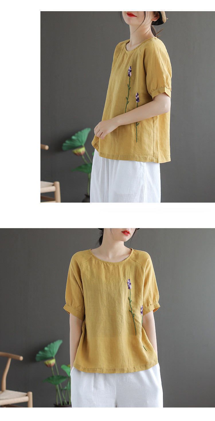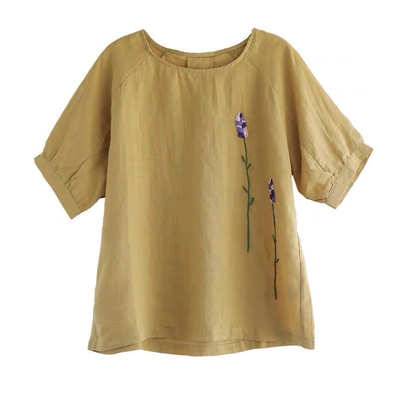 花朵刺繡棉麻T恤【買一送一】紫色+黃色各一件(每件499元)
