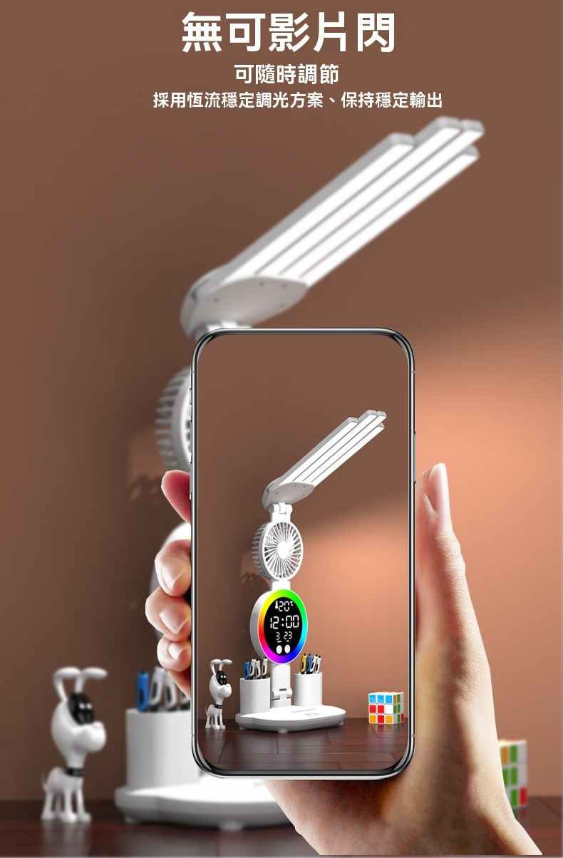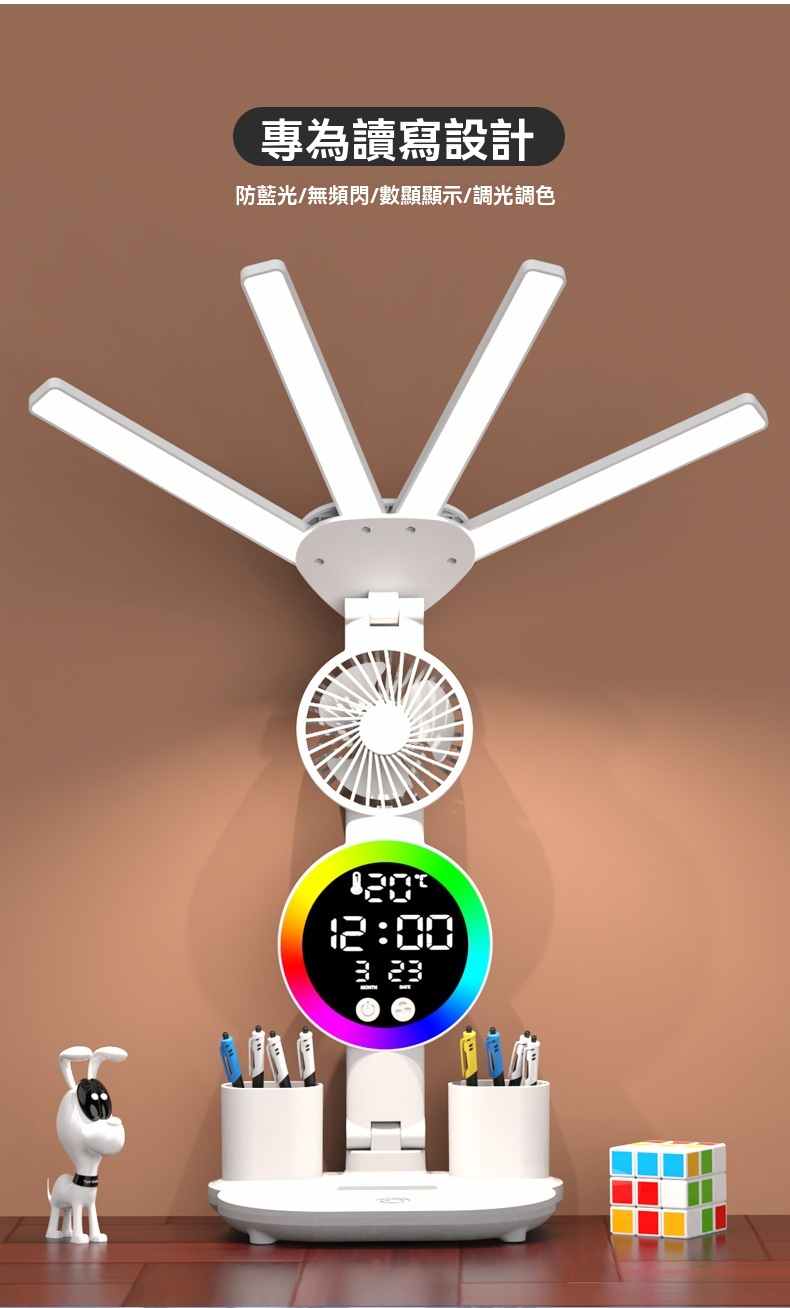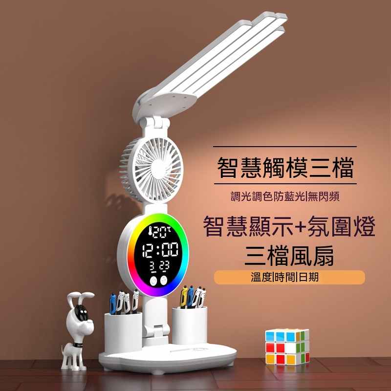 智能LED顯示屏多功能護眼檯燈(4頭氛圍燈-風扇時鐘-3200毫安鋰電池-充電款+贈送usb線)1組