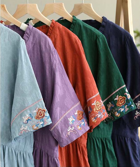收腰抽繩顯瘦棉麻中長款連衣裙【加400元得2件!】【紫色】+【綠色】各一件
