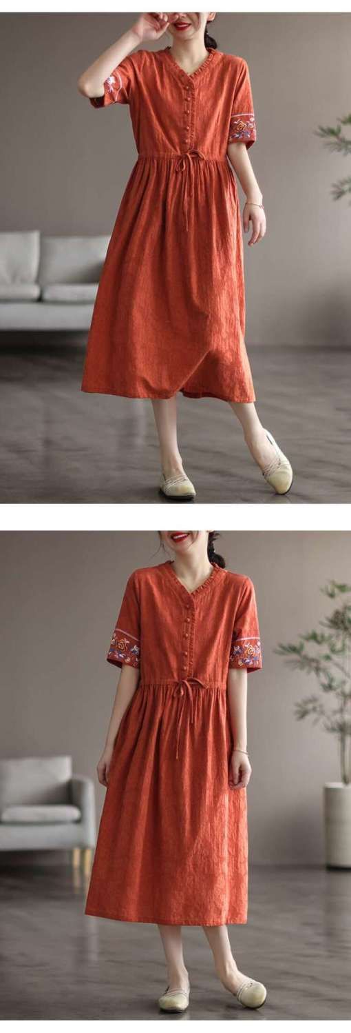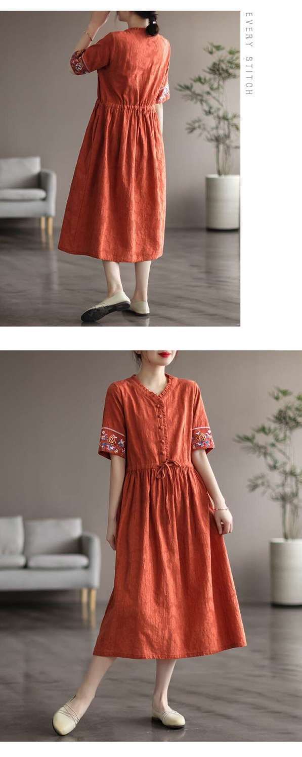收腰抽繩顯瘦棉麻中長款連衣裙【桔色】一件