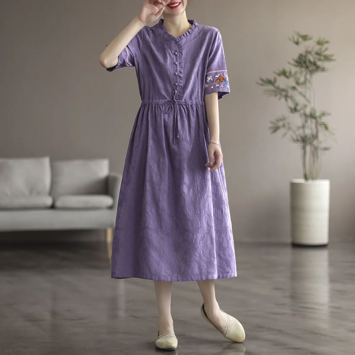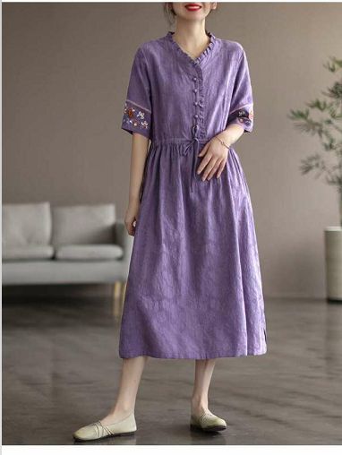 收腰抽繩顯瘦棉麻中長款連衣裙【加400元得2件!】【紫色】+【藍色】各一件