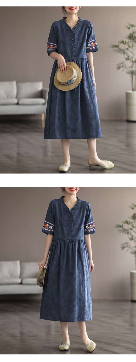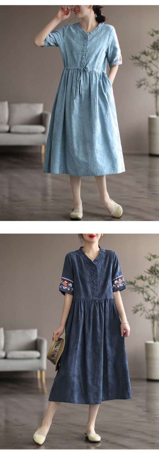 收腰抽繩顯瘦棉麻中長款連衣裙【加400元得2件!】【藍色】+【藏青色】各一件