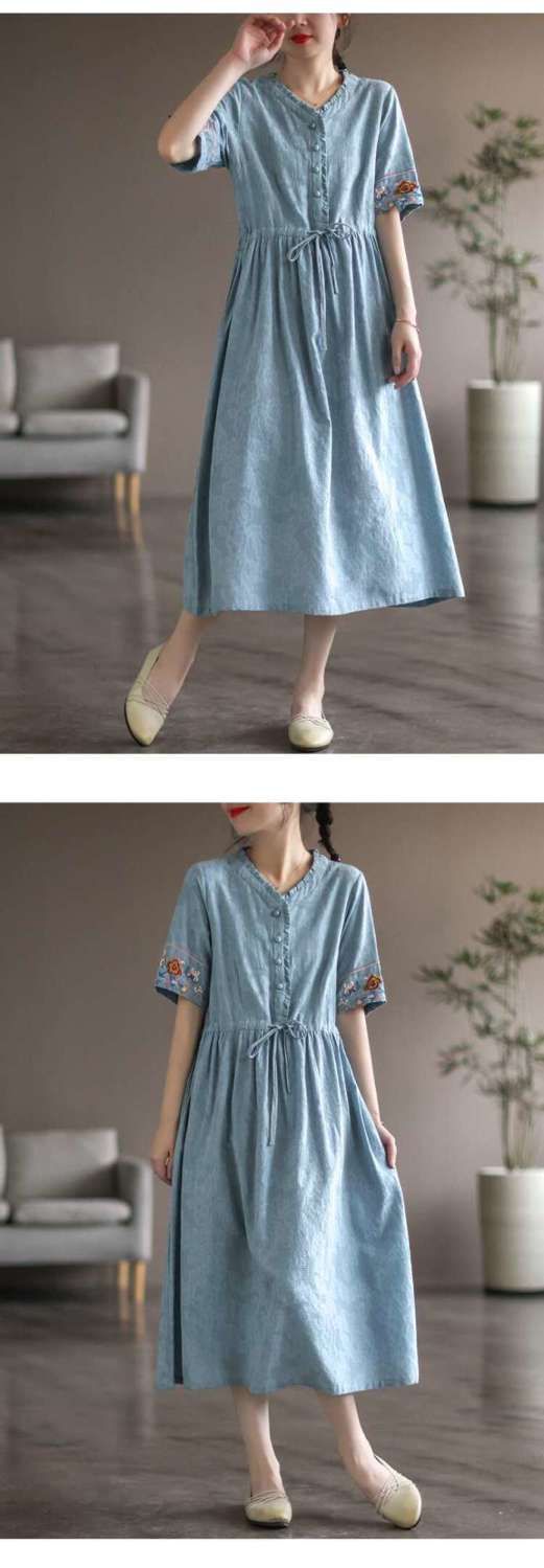 收腰抽繩顯瘦棉麻中長款連衣裙【藍色】一件