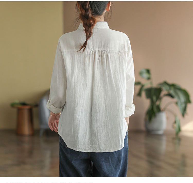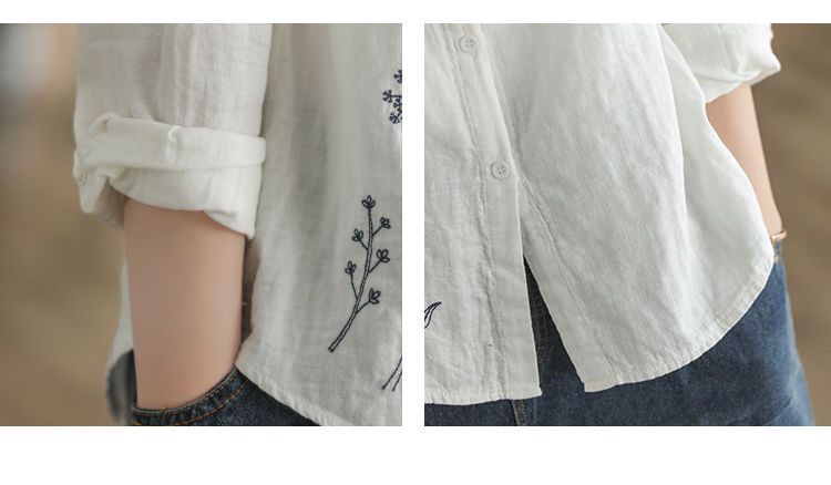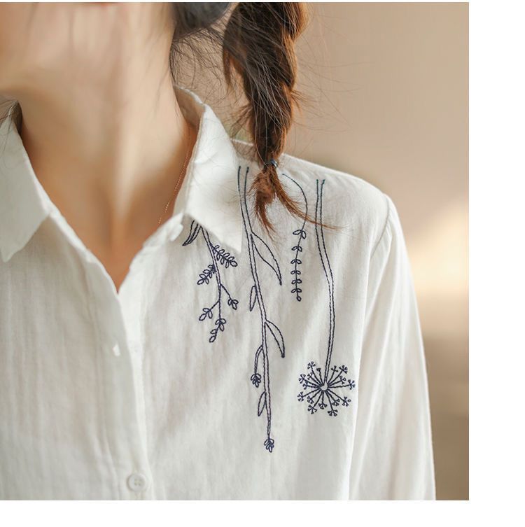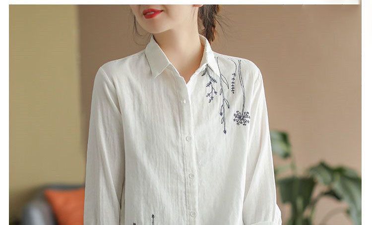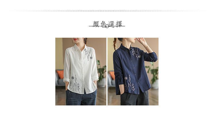 純棉簡約花卉刺繡長袖襯衣【買一送一】【白色】+【藍色】各一件(到手兩件,每件均價549元)