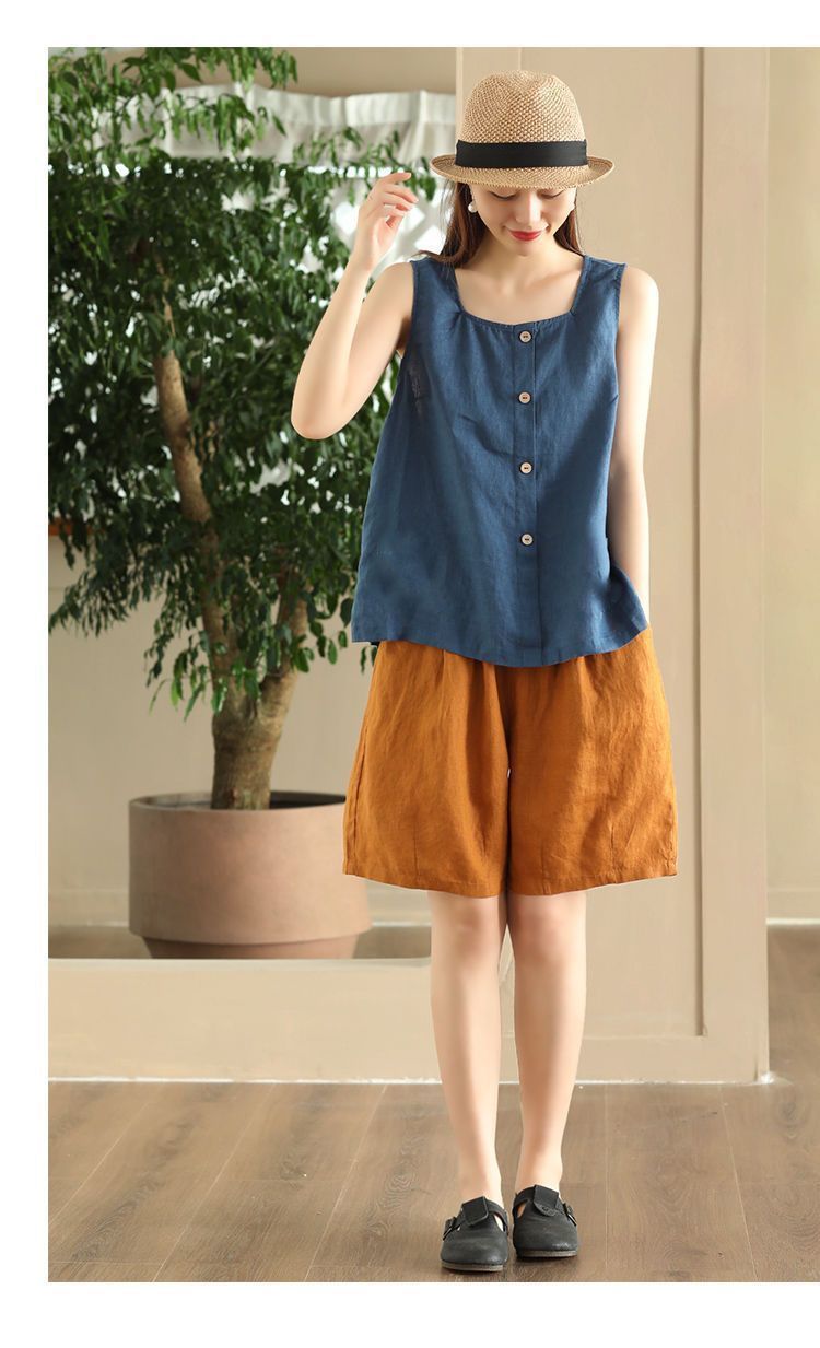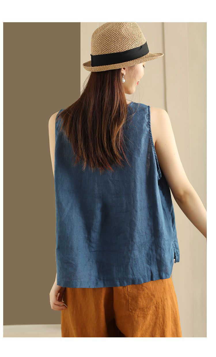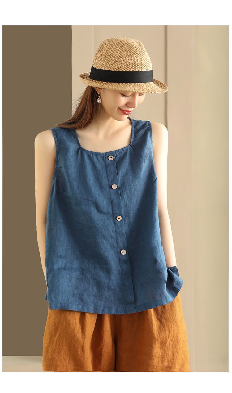 簡約鈕扣裝飾棉麻無袖T恤【買一送二】藍色兩件+咖色一件(到手3件!每件均價333元!)