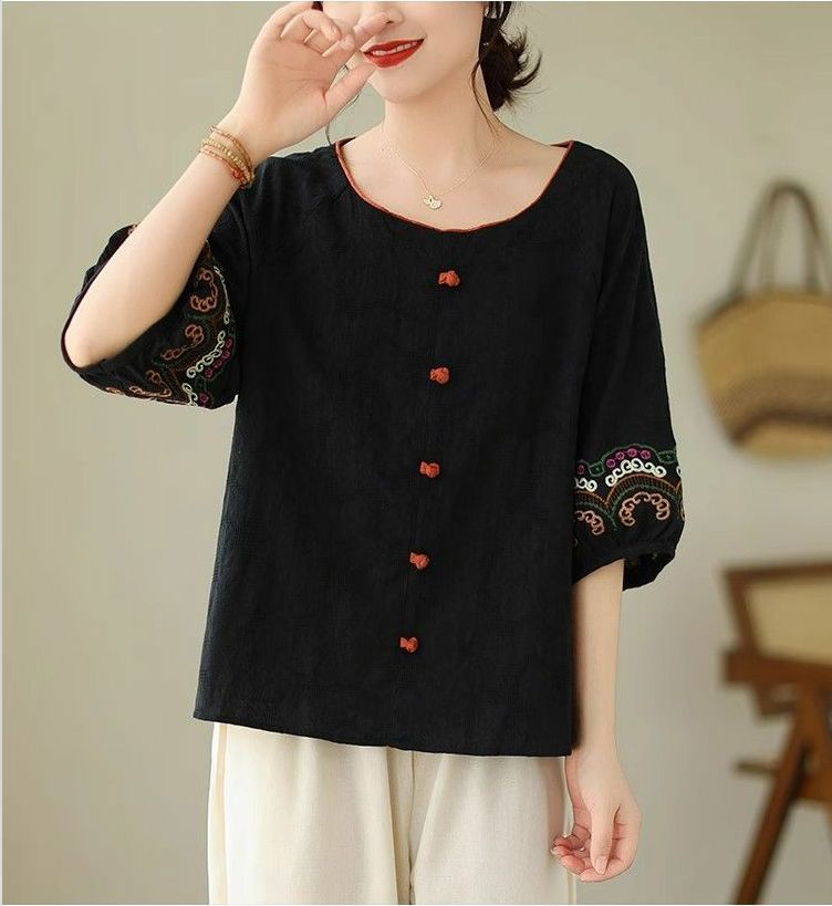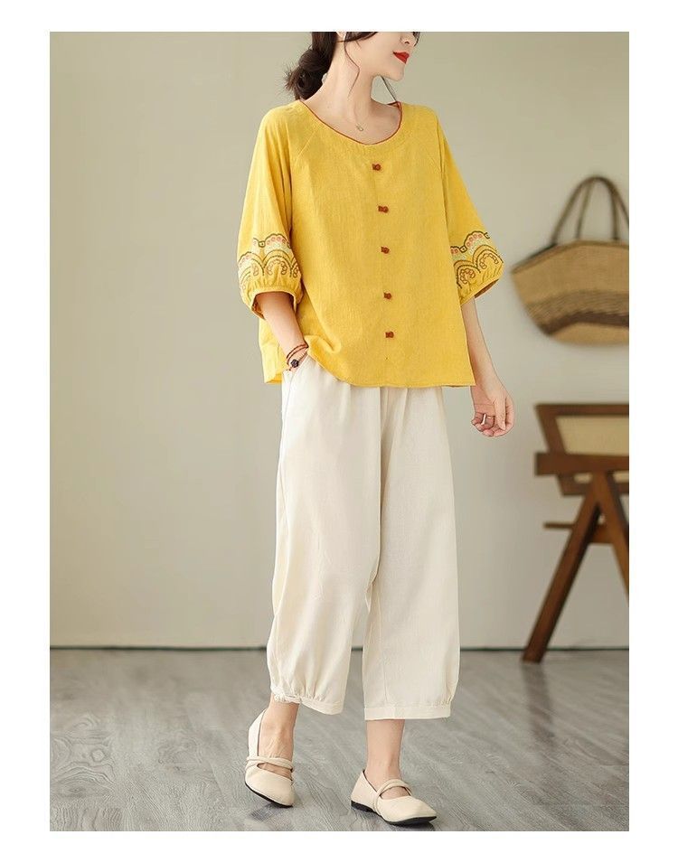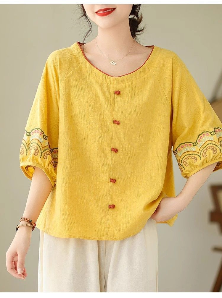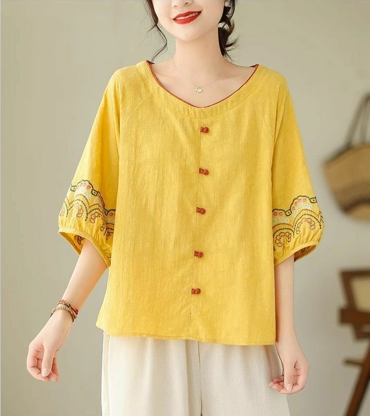 簡約淡雅棉麻半袖刺繡上衣【買一送一】【黃色】+【黑色】各一件(到手兩件,每件均價649元)