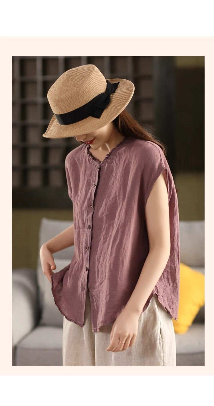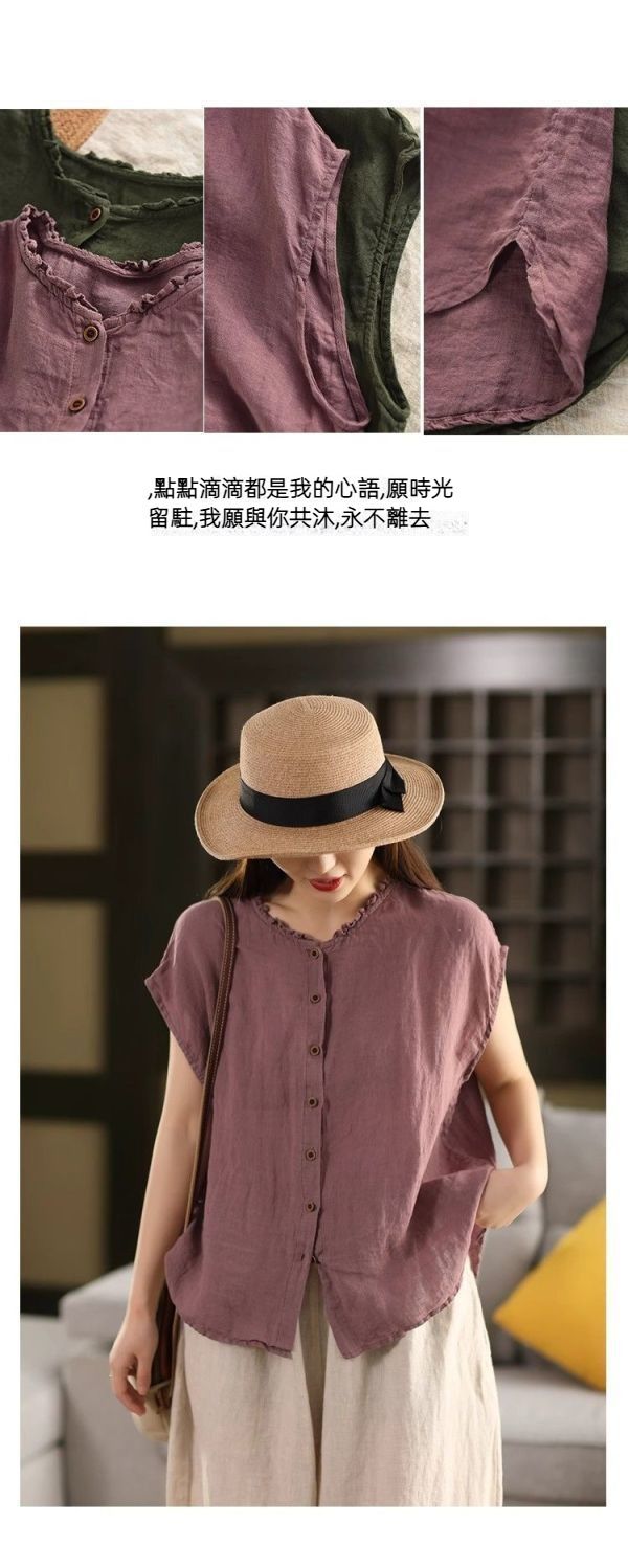 涼快寬鬆花邊領紐扣棉麻上衣【煙紫色】+【麻本色】各一件(到手兩件,每件均價549元)