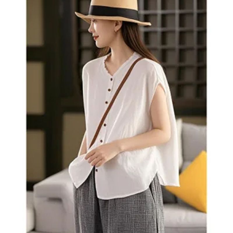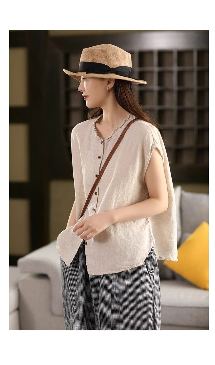 涼快寬鬆花邊領紐扣棉麻上衣【白色】+【麻本色】各一件(到手兩件,每件均價549元)