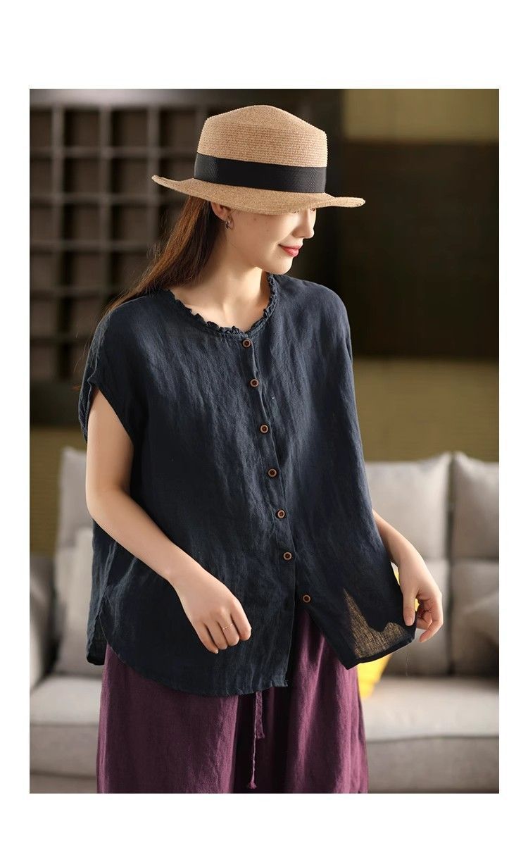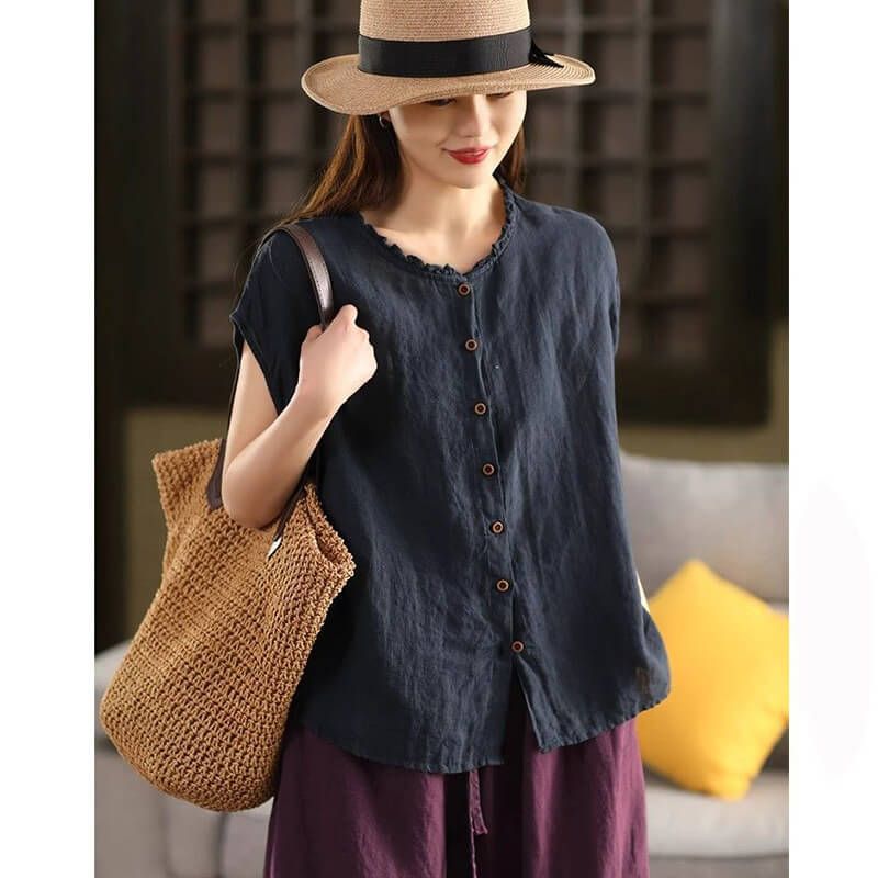 涼快寬鬆花邊領紐扣棉麻上衣【墨綠色】+【藏青色】各一件(到手兩件,每件均價549元)