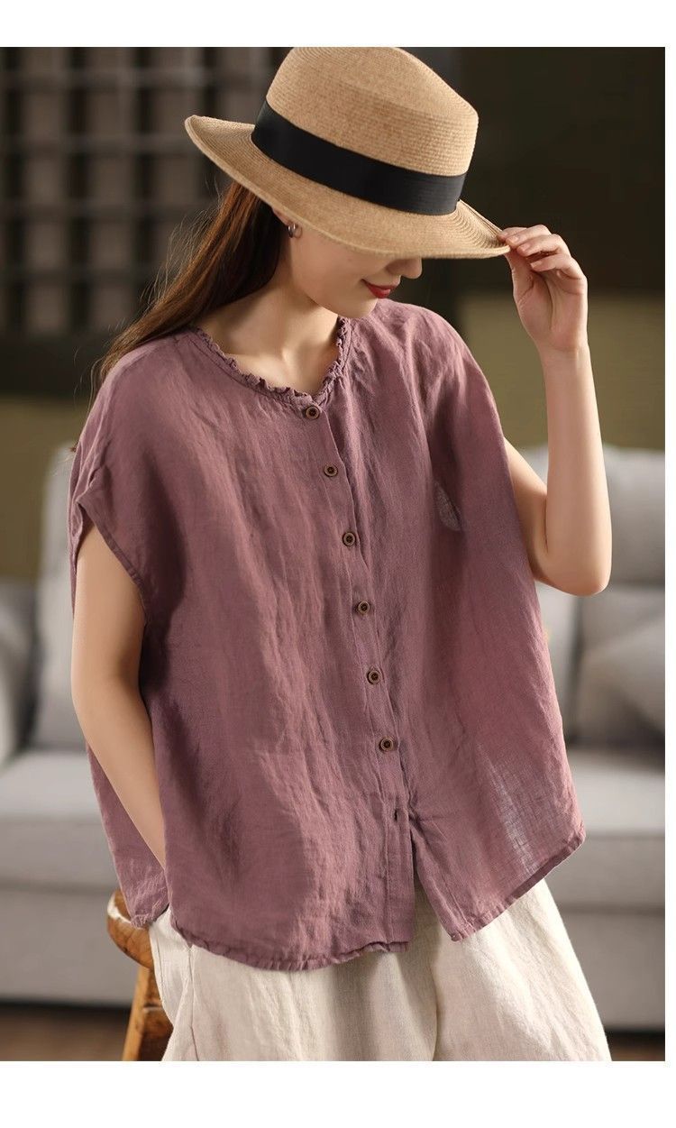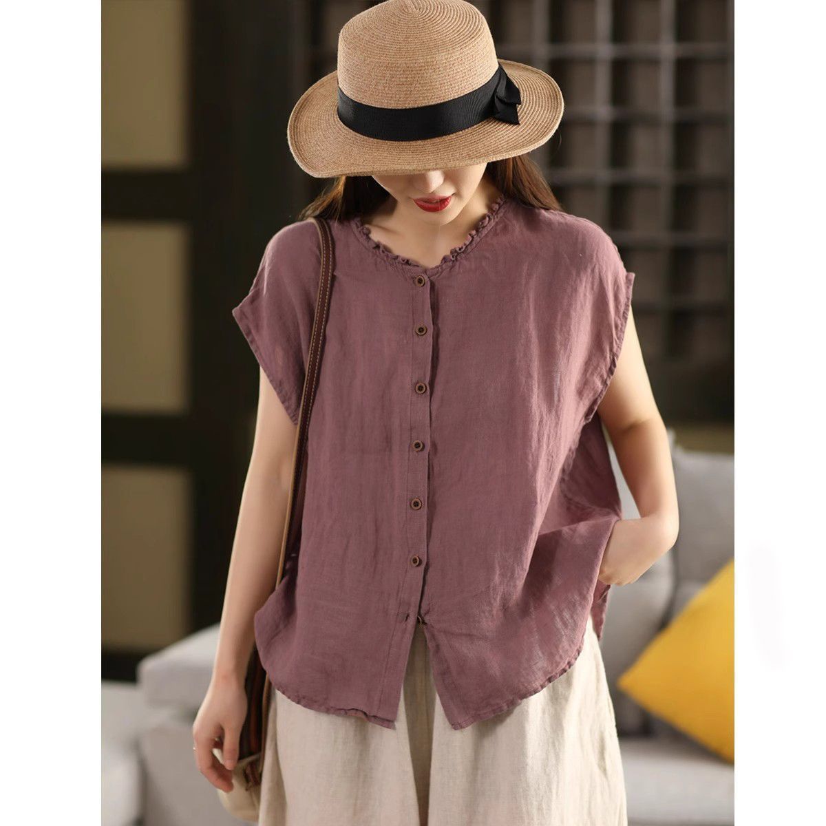 涼快寬鬆花邊領紐扣棉麻上衣【煙紫色】+【玫紅色】各一件(到手兩件,每件均價549元)