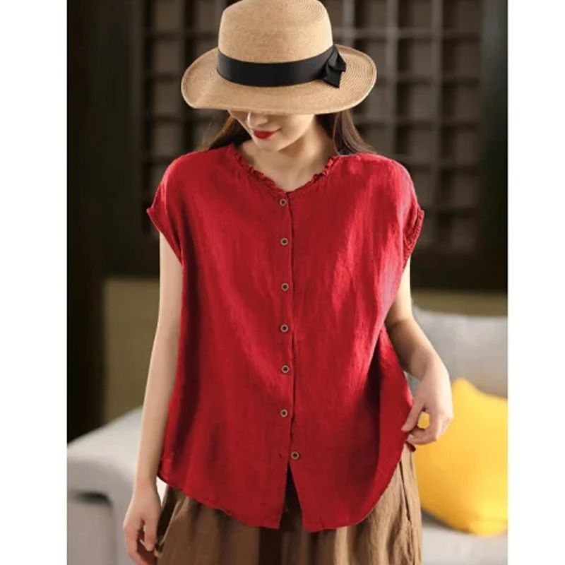 涼快寬鬆花邊領紐扣棉麻上衣【大紅色】+【玫紅色】各一件(到手兩件,每件均價549元)