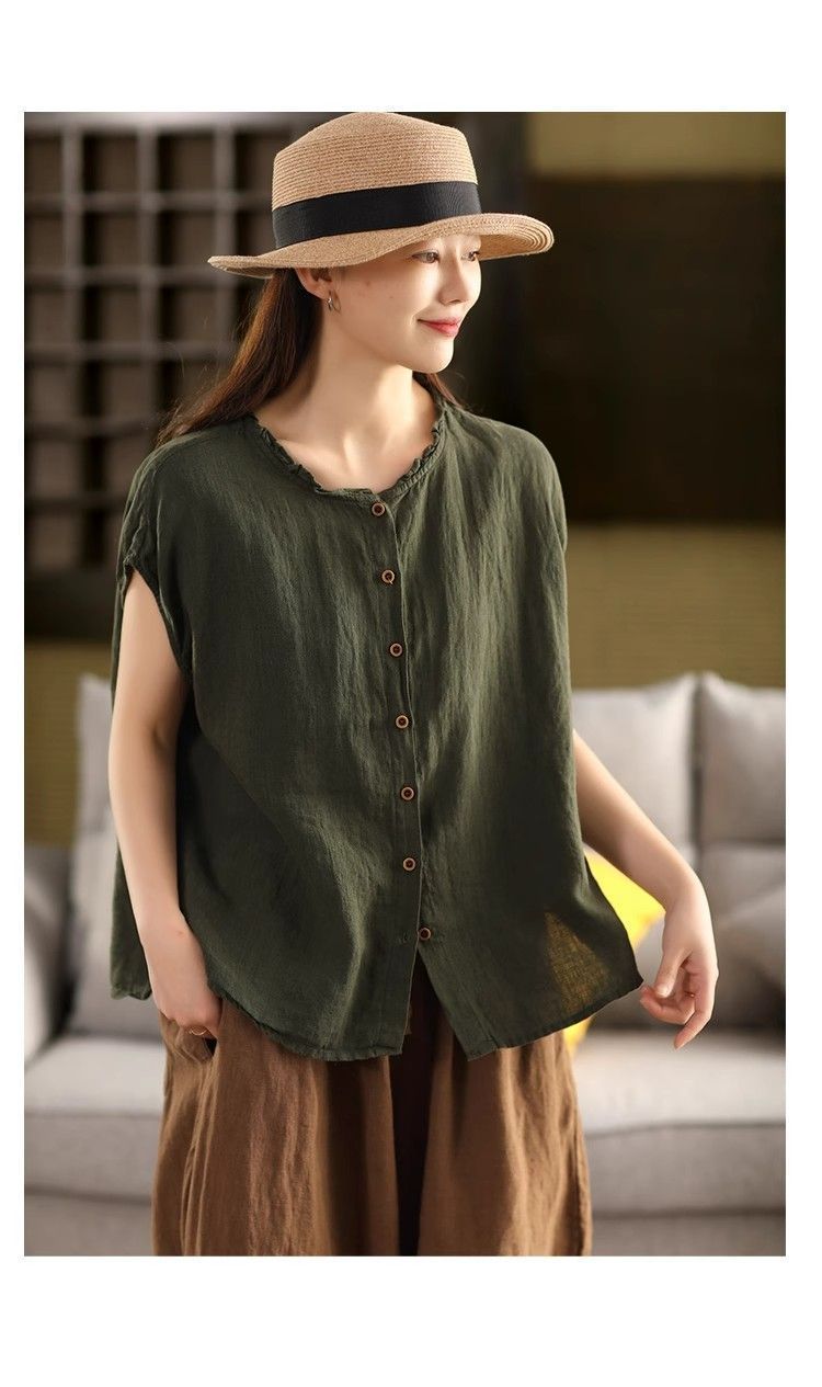 涼快寬鬆花邊領紐扣棉麻上衣【墨綠色】+【麻本色】各一件(到手兩件,每件均價549元)