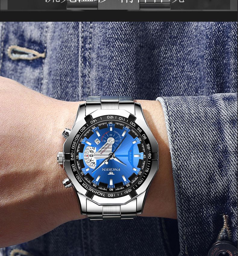 【美學新風尚】超大新日曆大錶盤男士手錶【黑鋼藍面】一塊