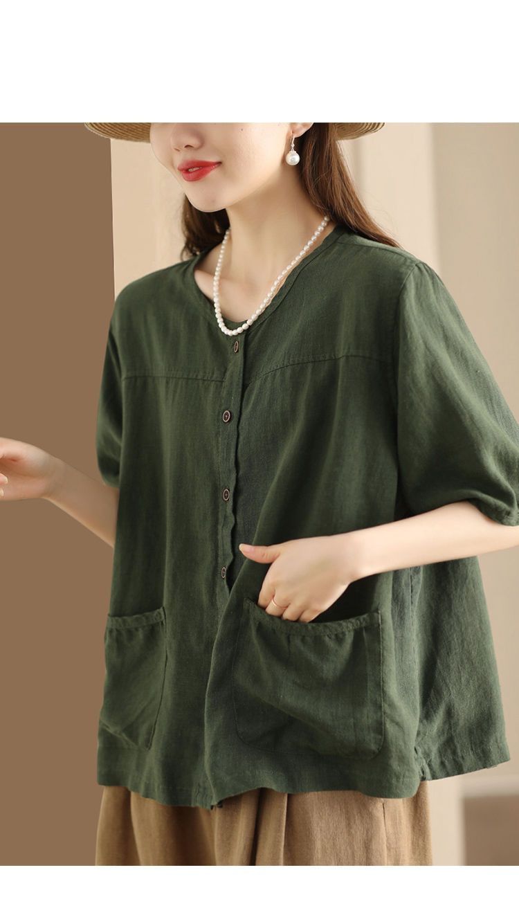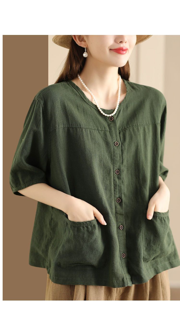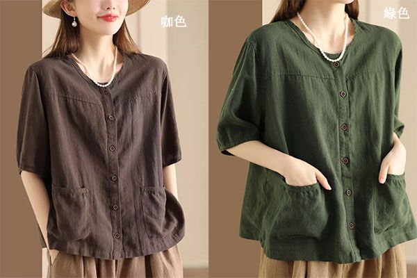 口袋設計復古氣質棉麻襯衫【咖色】+【綠色】各一件(到手兩件,每件均價499元)
