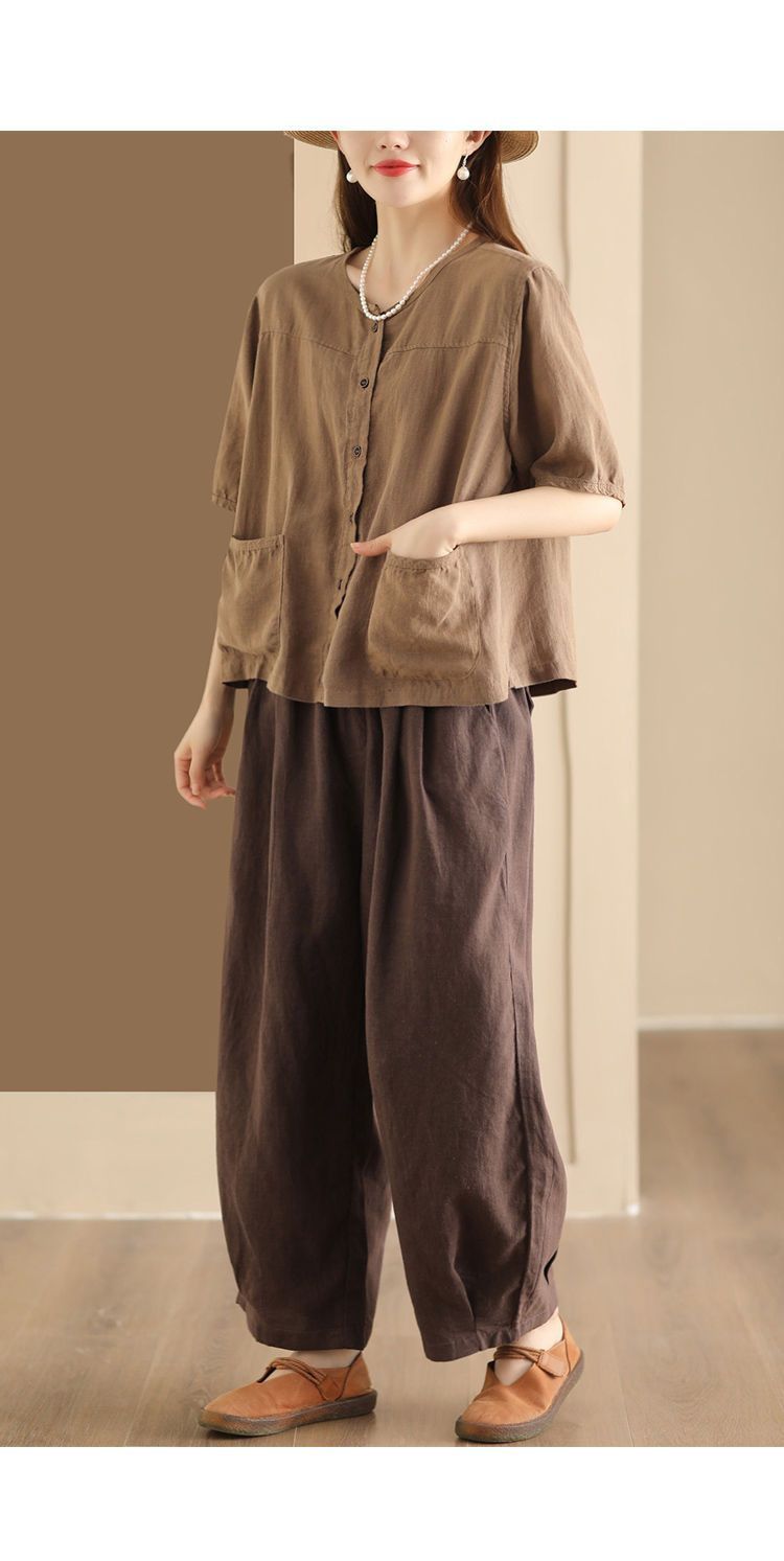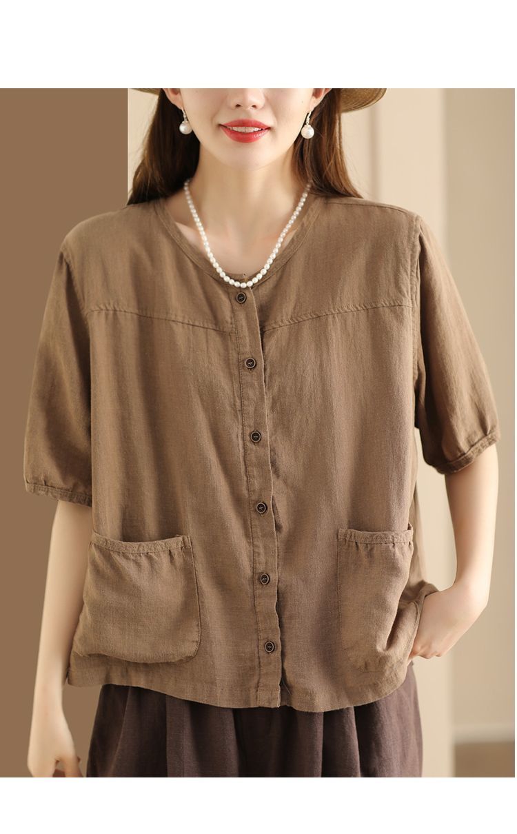 口袋設計復古氣質棉麻襯衫【咖色】+【卡其色】各一件(到手兩件,每件均價499元)