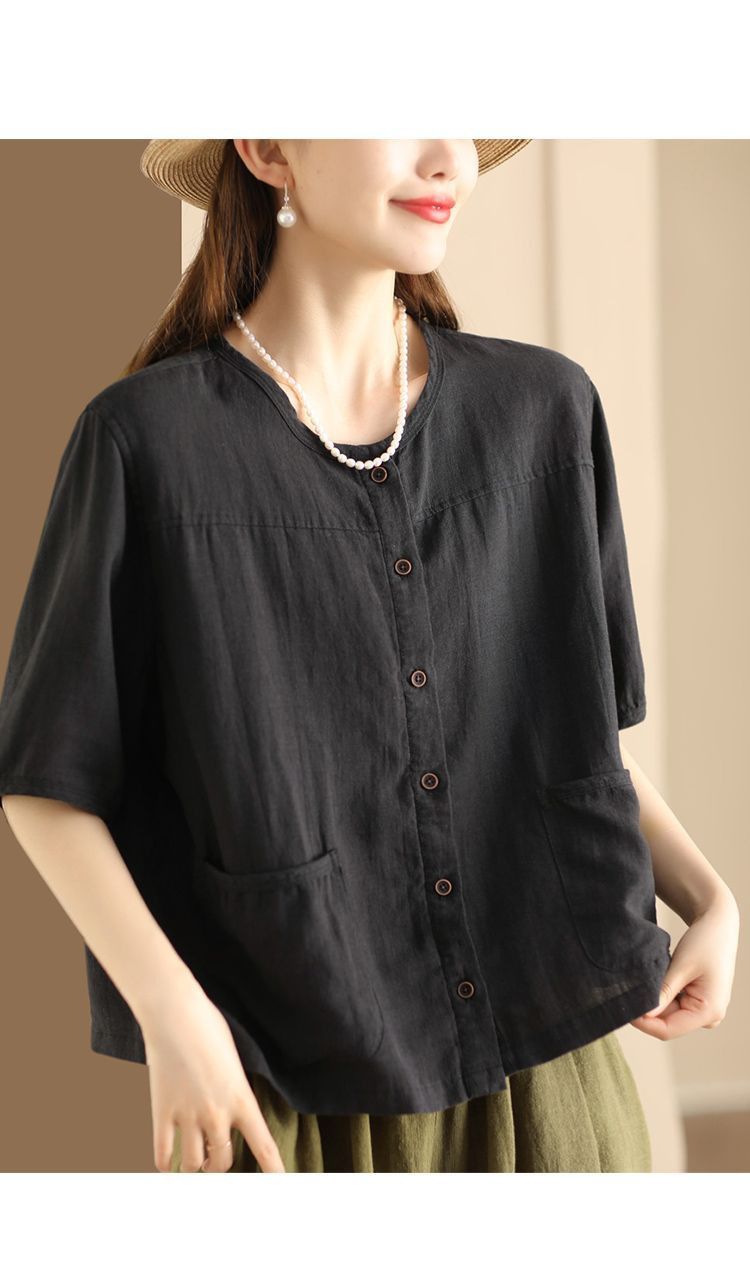 口袋設計復古氣質棉麻襯衫【粉色】+【黑色】各一件(到手兩件,每件均價499元)