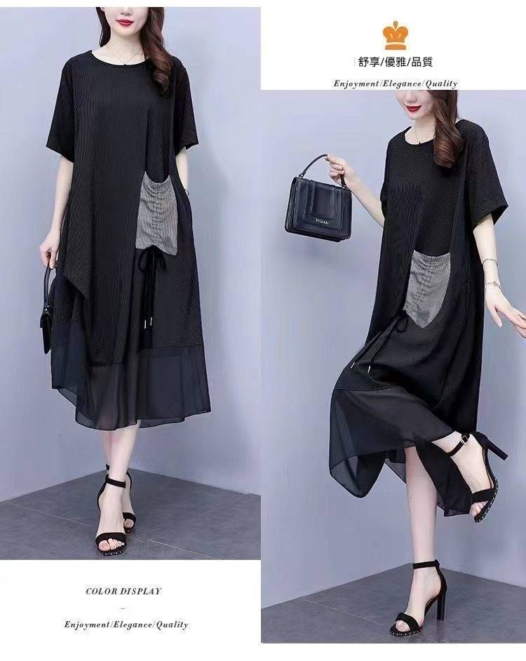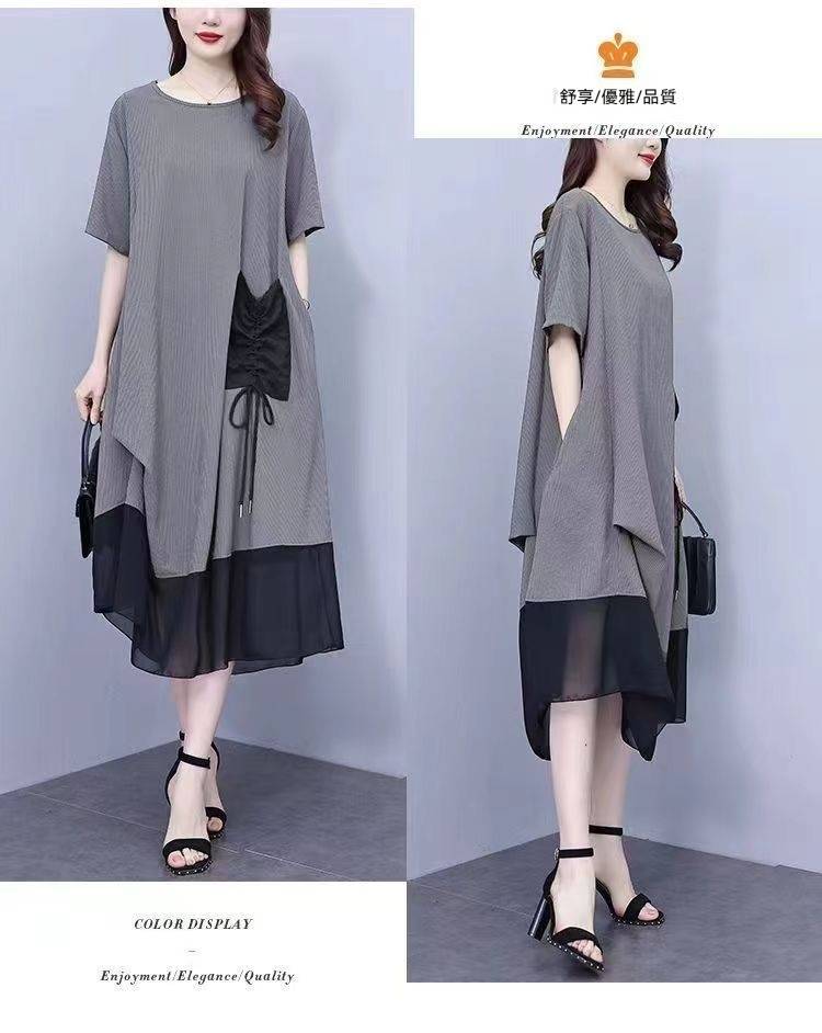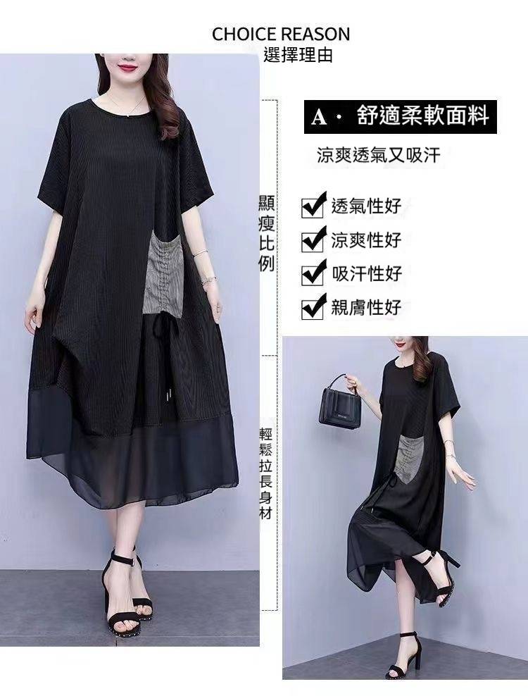 夏季顯瘦遮肉氣質拼接中長款連衣裙【買一送一】黑色+灰色各一件(到手兩件,每件均價549元)
