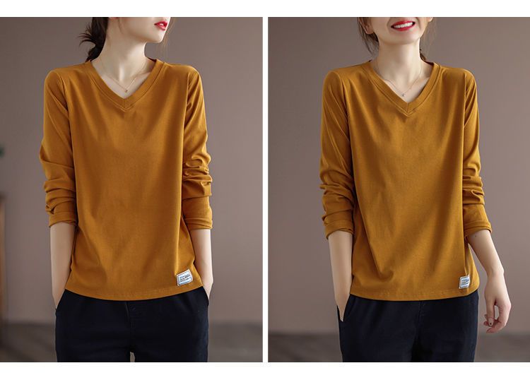 V領百搭女士純色長袖上衣【買一送二】【黃色】+【白色】+【藍色】各一件(到手3件,每件均價333元!)