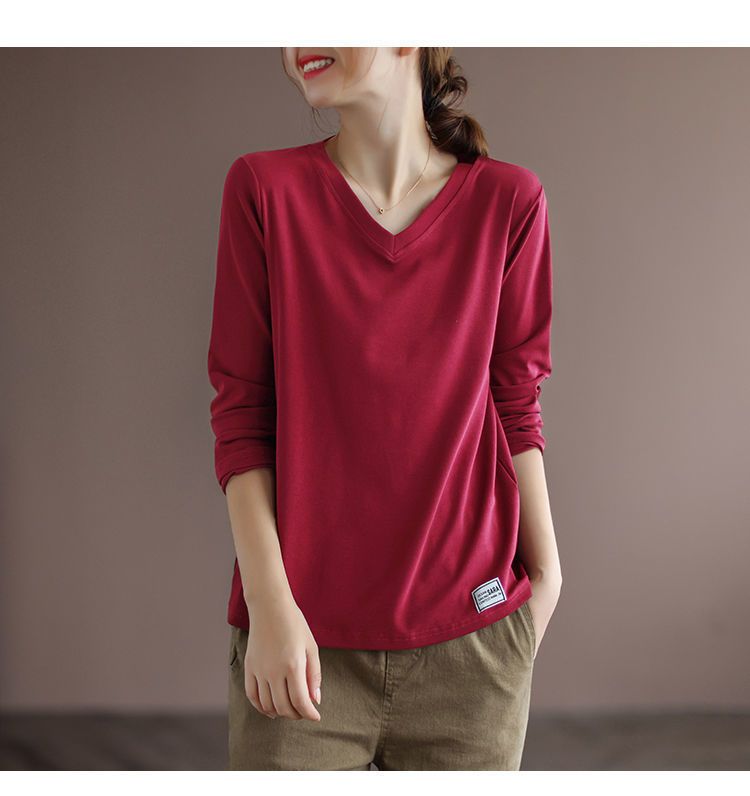 V領百搭女士純色長袖上衣【買一送二】【紅色】+【黃色】+【藍色】各一件(到手3件,每件均價333元!)