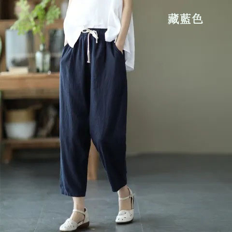 棉麻復古寬鬆純色百搭休閒九分褲【買一送一】【藏藍色】+【森林綠】各一件(到手兩條,每條均價549元)
