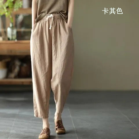 棉麻復古寬鬆純色百搭休閒九分褲【買一送一】【卡其色】+【藏藍色】各一件(到手兩條,每條均價549元)