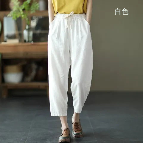 棉麻復古寬鬆純色百搭休閒九分褲【買一送一】【白色】+【卡其色】各一件(到手兩條,每條均價549元)