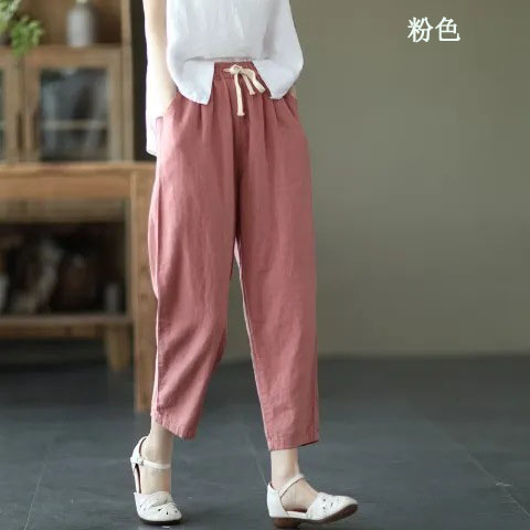 棉麻復古寬鬆純色百搭休閒九分褲【買一送一】【粉色】+【卡其色】各一件(到手兩條,每條均價549元)