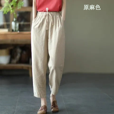 棉麻復古寬鬆純色百搭休閒九分褲【買一送一】【卡其色】+【原麻色】各一件(到手兩條,每條均價549元)