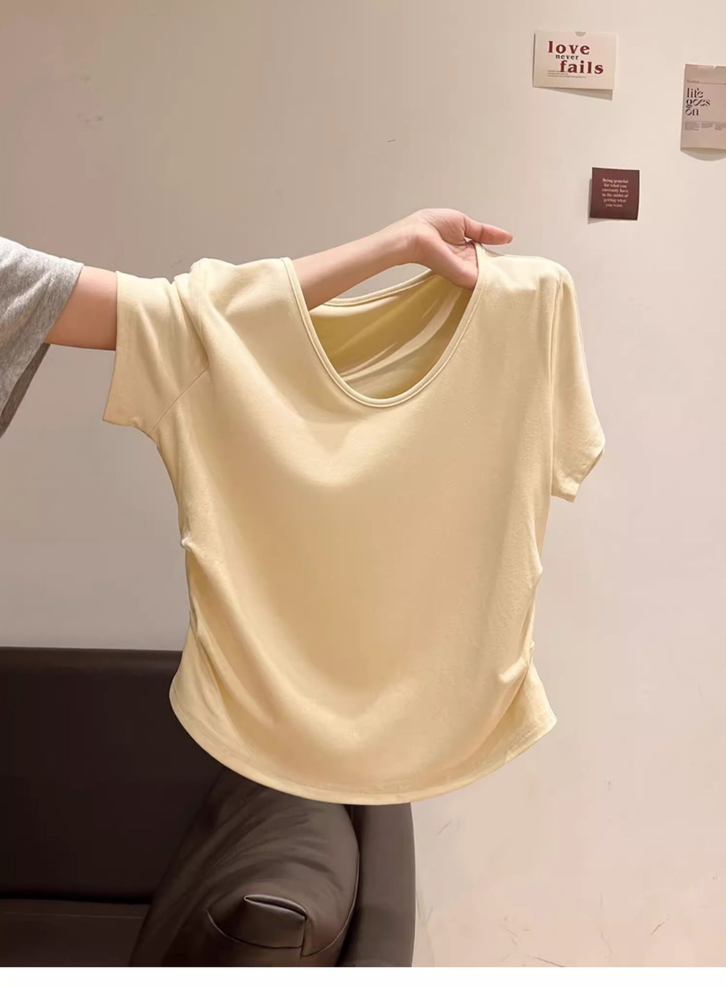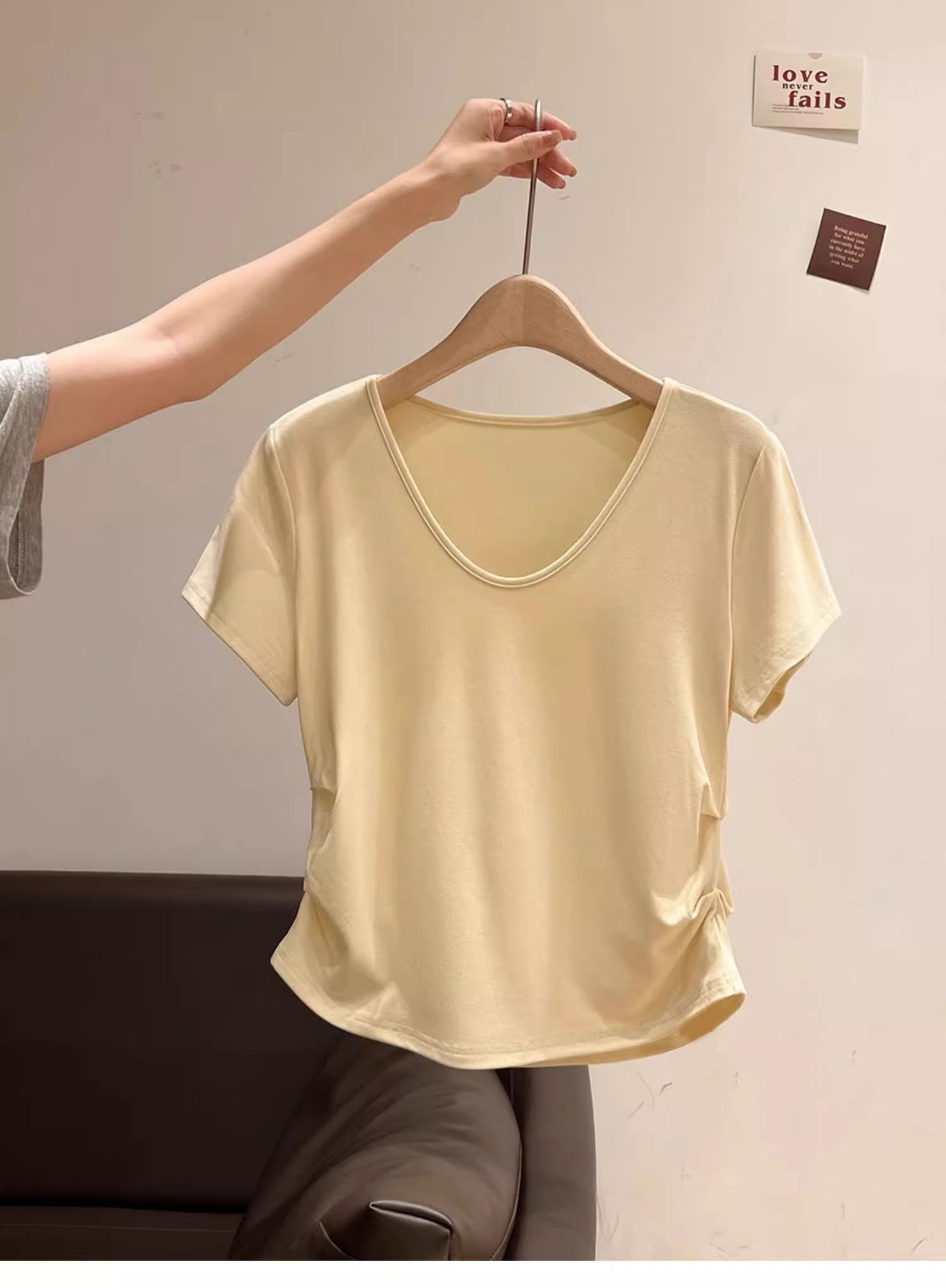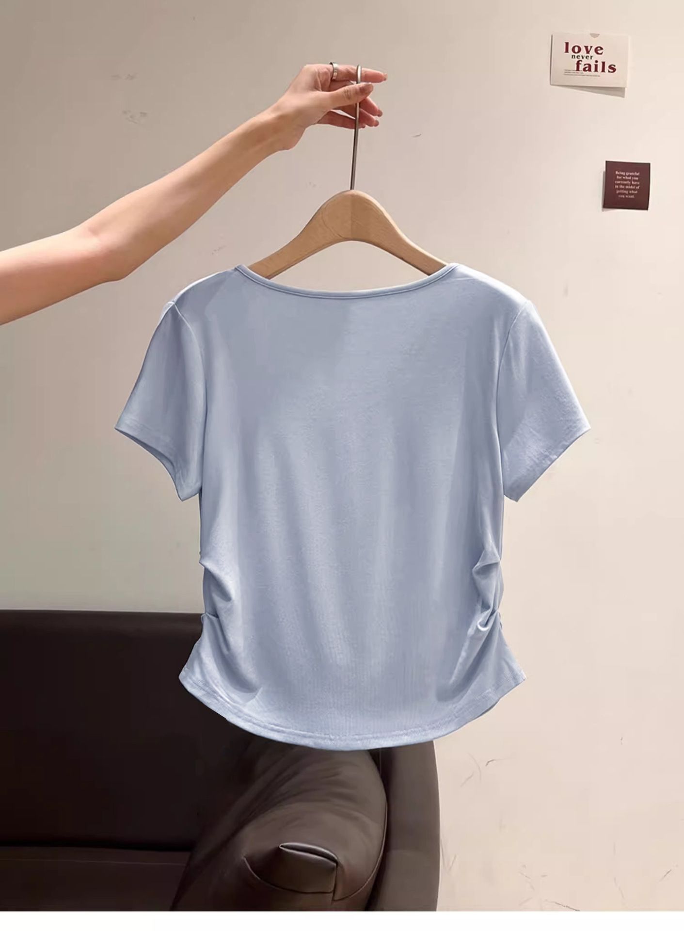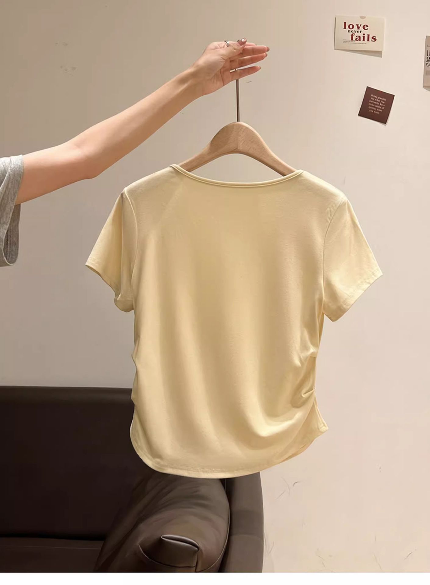 夏季短款褶皺收腰顯瘦高級V領T恤【買一送二】黃色+白色+藍色各一件(到手3件!每件均價333元!)