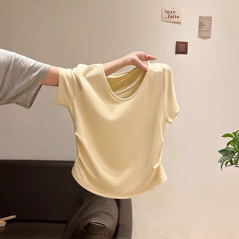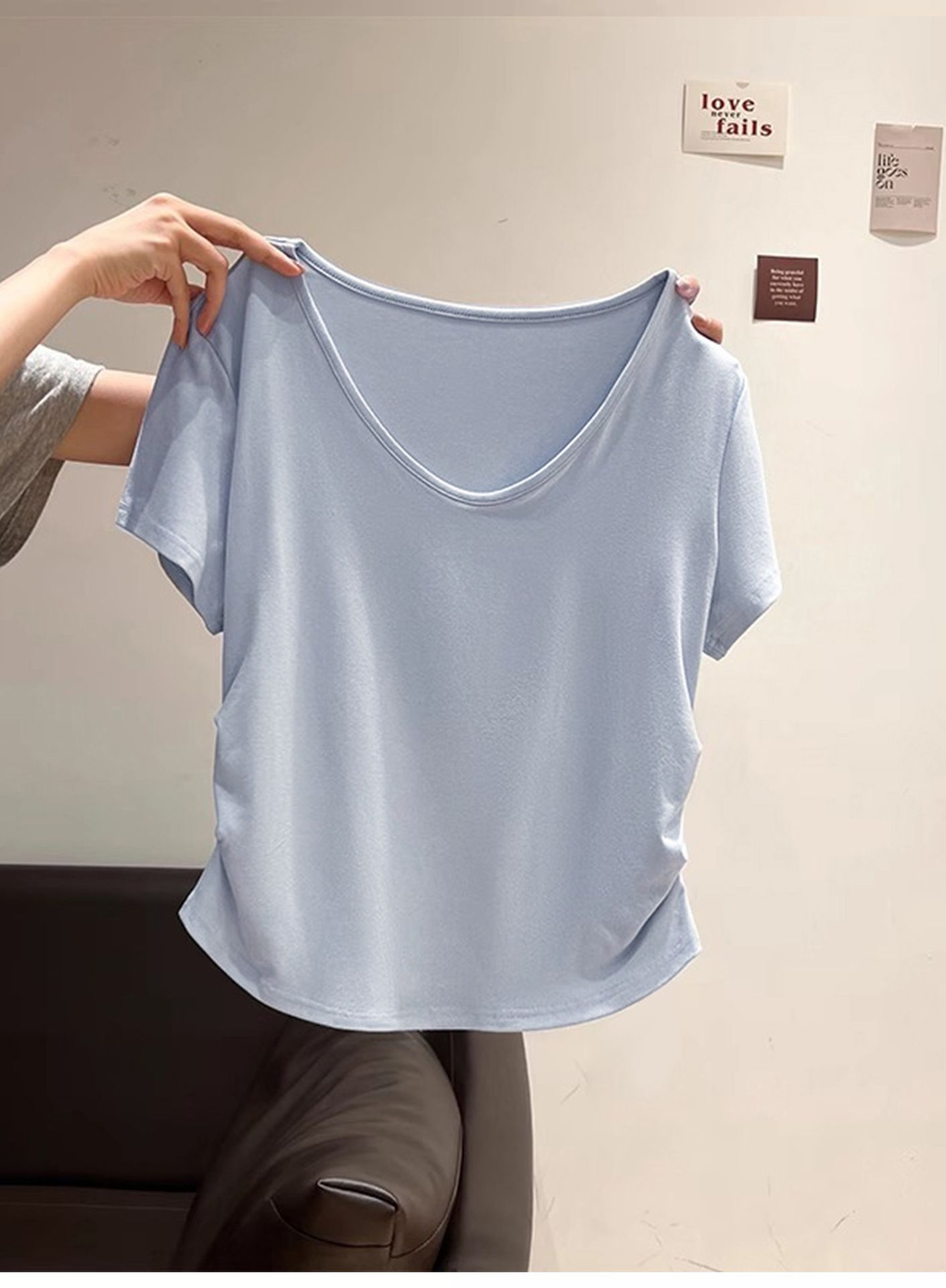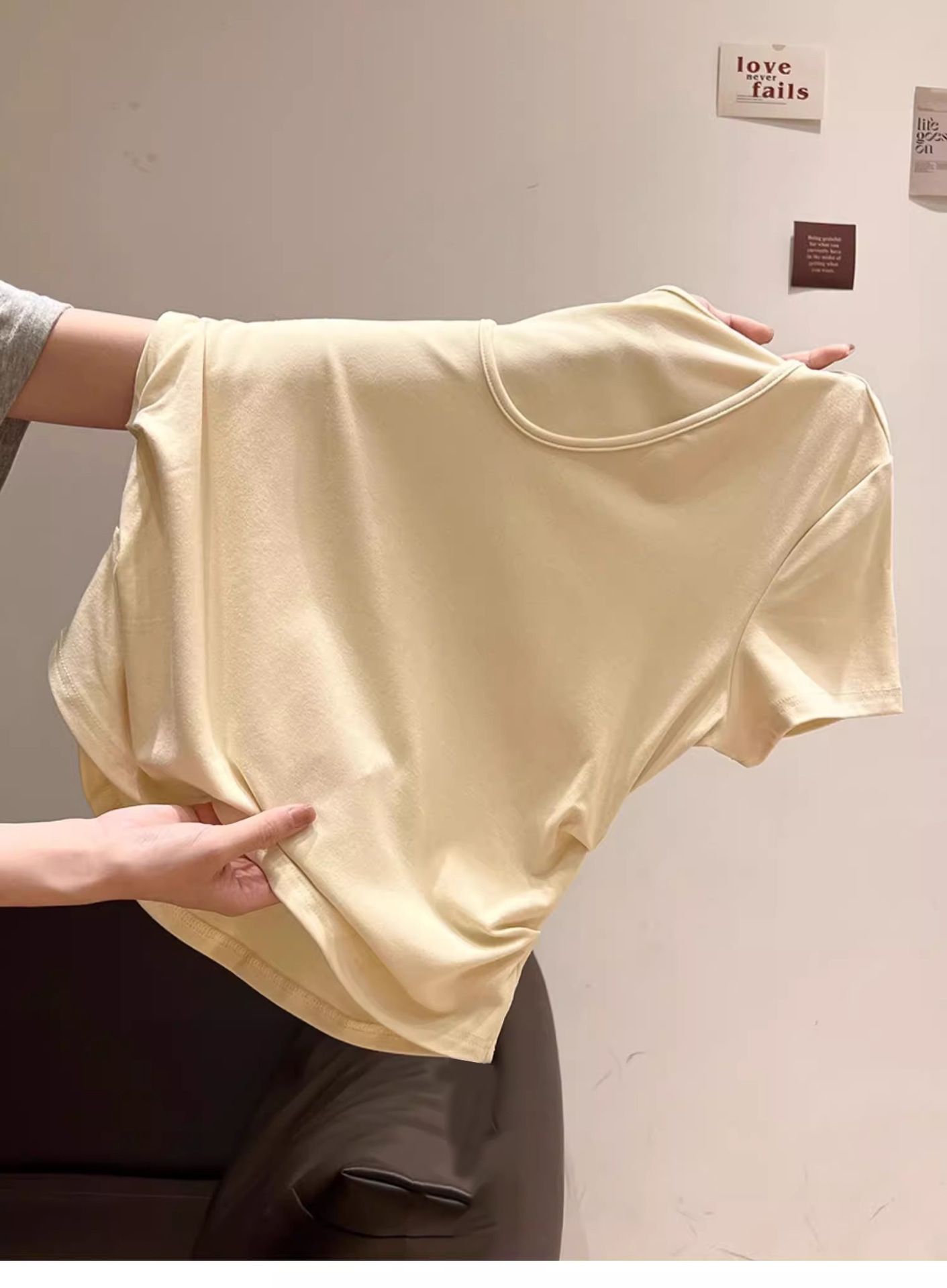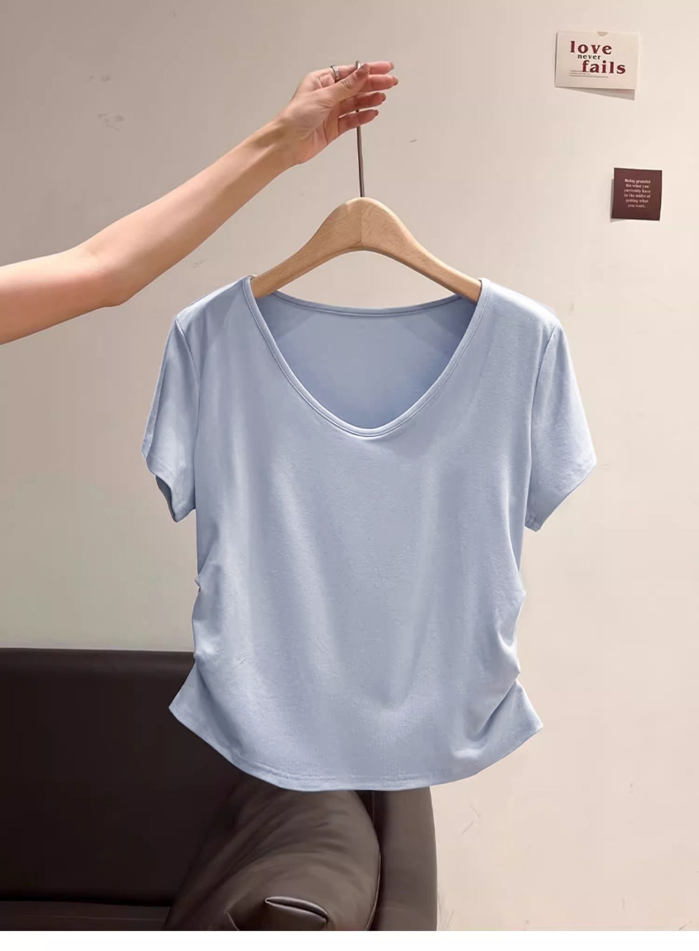 夏季短款褶皺收腰顯瘦高級V領T恤【買一送二】黃色+白色+藍色各一件(到手3件!每件均價333元!)